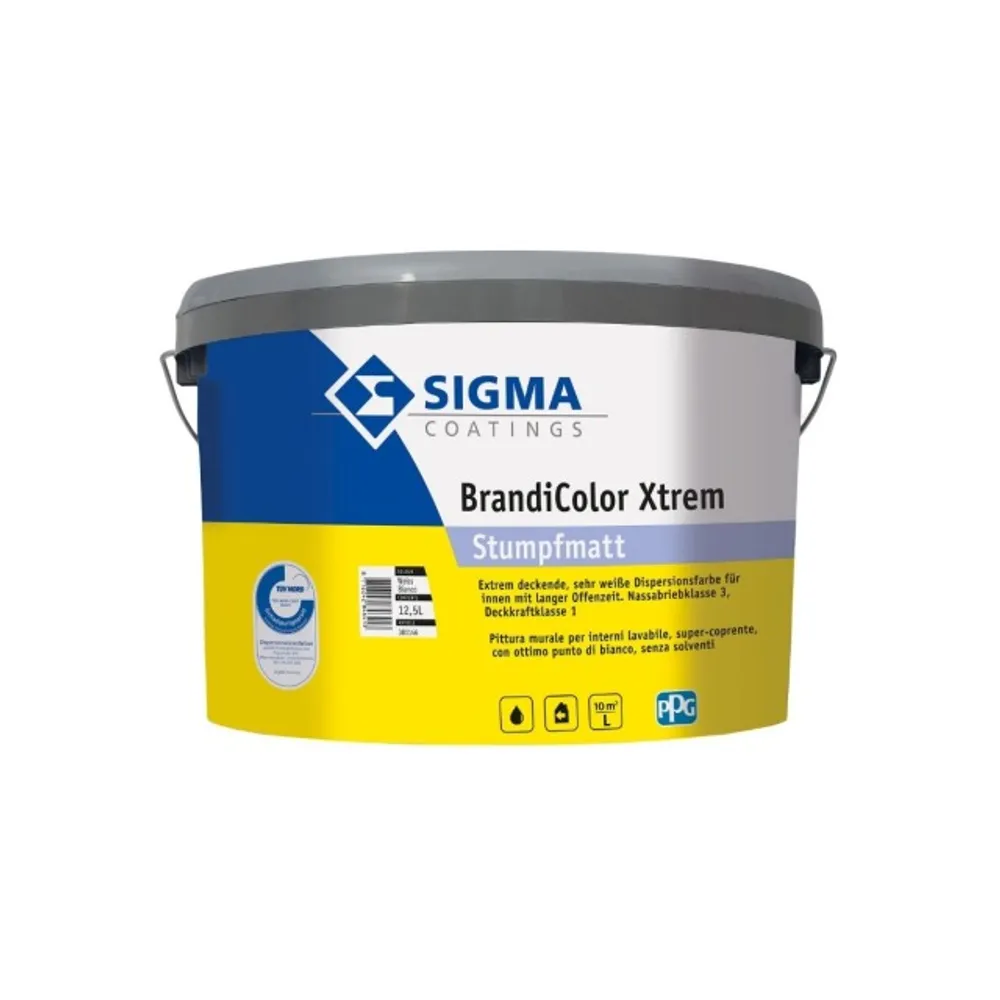 Sigma BrandiColor Xtrem, sehr gut deckende, sehr weiße, offenzeitgesteuerte, stumpf- matte Dispersionsfarbe für innen. Raumlufthygienisch einwandfrei durch lösemittel- und weichmacherfreie sowie emissions- und schadstoffarme Formulierung gemäß TÜV-Nord und WKI Fraunhofer Institut. Für hochdeckende Neu- und Renovierungsanstriche auf Wand- und Deckenflächen im Innenbereich.