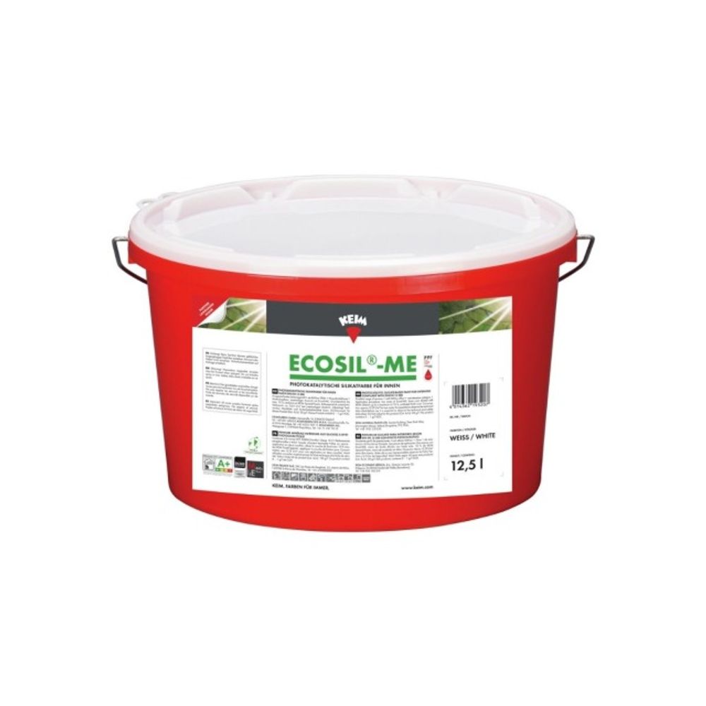 Hochwertige, universelle Silikatfarbe für innen nach DIN EN 13300 und DIN 18363 Abs. 2.4.1, Dispersionssilikatfarbe, Nassabriebklasse 1. KEIM Ecosil-ME ist hoch scheuerbeständig und reduziert Schadgase und Gerüche, photokatalytisch wirksam. Besonders geeignet für stark beanspruchte Bereiche wie öffentliche Gebäude, Schulen, Hotels, Kliniken usw. Für Allergiker geeignet.