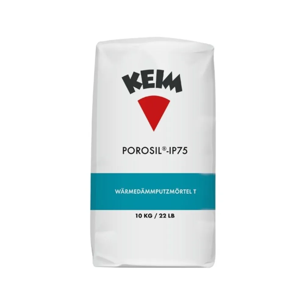 Keim Porosil-IP75 ist ein mineralischer Werktrockenmörtel der Dämmputzklasse T1 gemäß EN 998-1. Dieser hochwertige Systemleichtputz zeichnet sich durch seine wärmedämmenden Eigenschaften und hervorragende Verarbeitbarkeit aus. Die Zusammensetzung basiert auf einer sorgfältig abgestimmten Mischung aus hydraulischen, mineralischen Bindemittel, fraktionierten Sanden und ausschließlich mineralischen Leichtzuschlägen. Eine rationelle Arbeitsweise ist durch die Geschmeidigkeit des Materials sowie der hervorragenden Maschinengängigkeit sichergestellt.